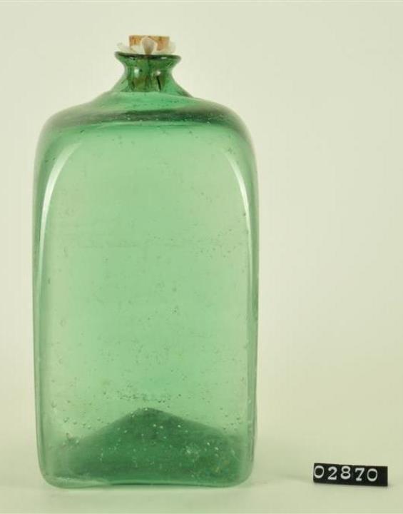 Vierkantflasche aus grünem Glas mit trichterförmig ausgebogener Mündung und Korkstopfen. Bis zum Halsansatz überstochene Wandung. Hochgestochener Boden mit rundem Hefteisenabriss.