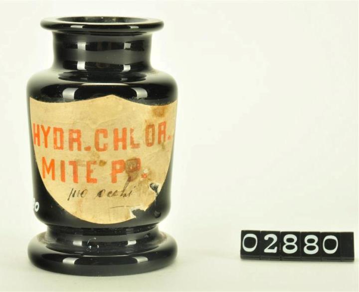 Schwarzes, rundes Pulverglas ohne Schliffstopfen. Fuß mit Hefteisenabriss und nachgeschliffenem Boden. Ausladender, flacher Mündungsrand. Eingebranntes, weißes Emailleschild in der Form eines Schweizer Schildes mit goldenem Rand. Schwarz signiert.