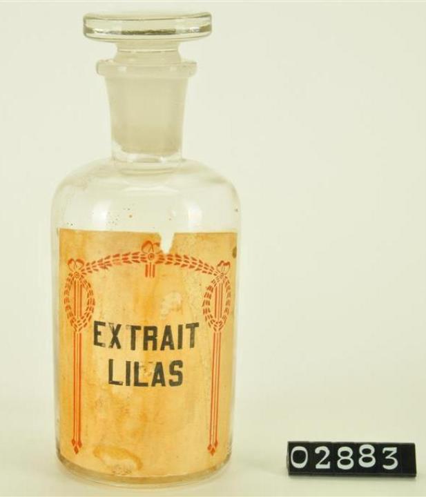 Farblose, runde Enghalsflasche mit konisch zulaufendem Hals und flachem, etwas auskragendem Mündungsrand. Schliffstopfen mit flachem Griff. Schwarz signiert.
