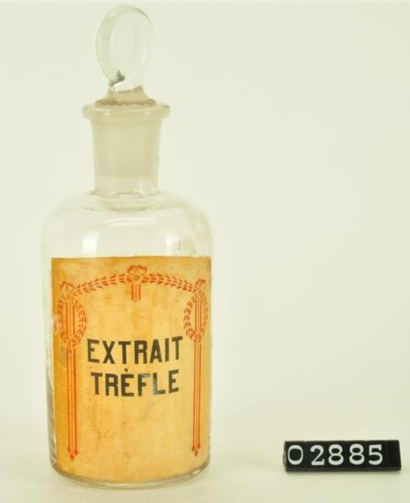 Farblose, runde Enghalsflasche mit konisch zulaufendem Hals und flachem, etwas auskragendem Mündungsrand. Schliffstopfen mit großer Griffscheibe. Schwarz signiert.