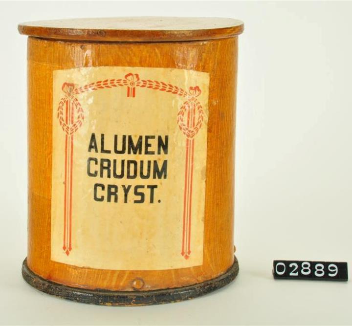Braune, zylinderförmige Standdose aus maseriertem und lackiertem Hartpapier, leicht vorstehender, dunkelbrauner Holzboden und vorstehender, flacher Steckdeckel aus Holz. Schwarz signiert. Enthielt Alaun.