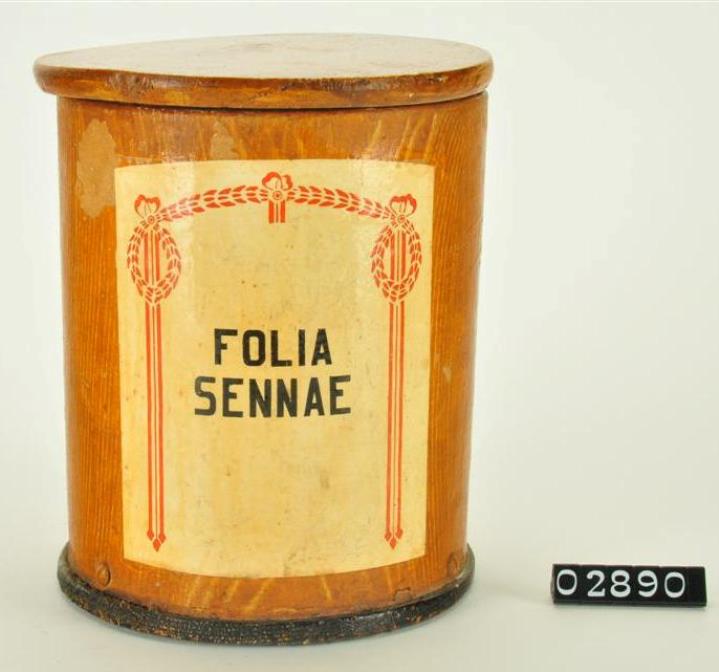 Braune, zylinderförmige Standdose aus maseriertem und lackiertem Hartpapier, leicht vorstehender, dunkelbrauner Holzboden und vorstehender, flacher Steckdeckel aus Holz. Schwarz signiert. Enthielt Sennesblätter.