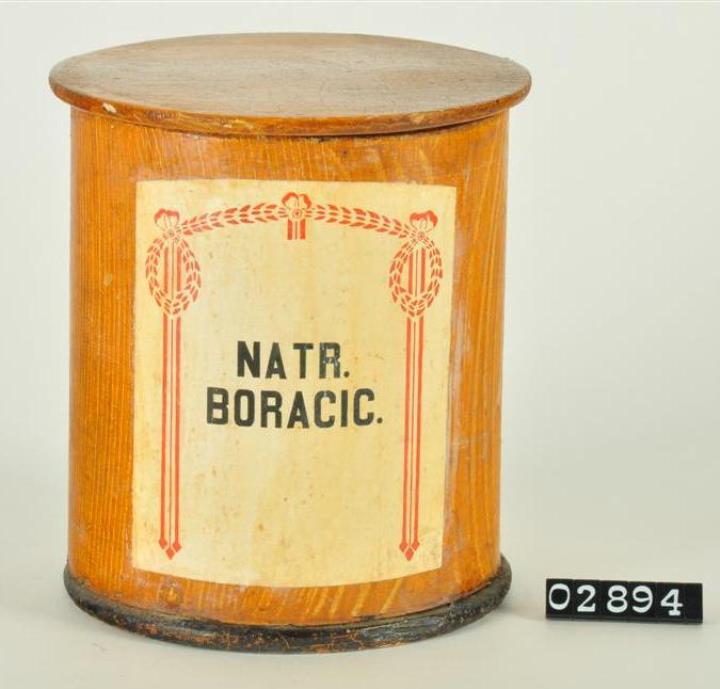 Braune, zylinderförmige Standdose aus maseriertem und lackiertem Hartpapier, leicht vorstehender, dunkelbrauner Holzboden und vorstehender, flacher Steckdeckel aus Holz. Schwarz signiert. Enthielt Natriumborat = Borax.
