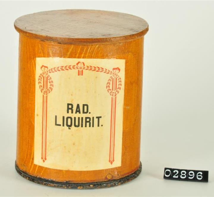 Braune, zylinderförmige Standdose aus maseriertem und lackiertem Hartpapier, leicht vorstehender, dunkelbrauner Holzboden und vorstehender, flacher Steckdeckel aus Holz. Schwarz signiert. Enthält Süßholzwurzel, ganz.