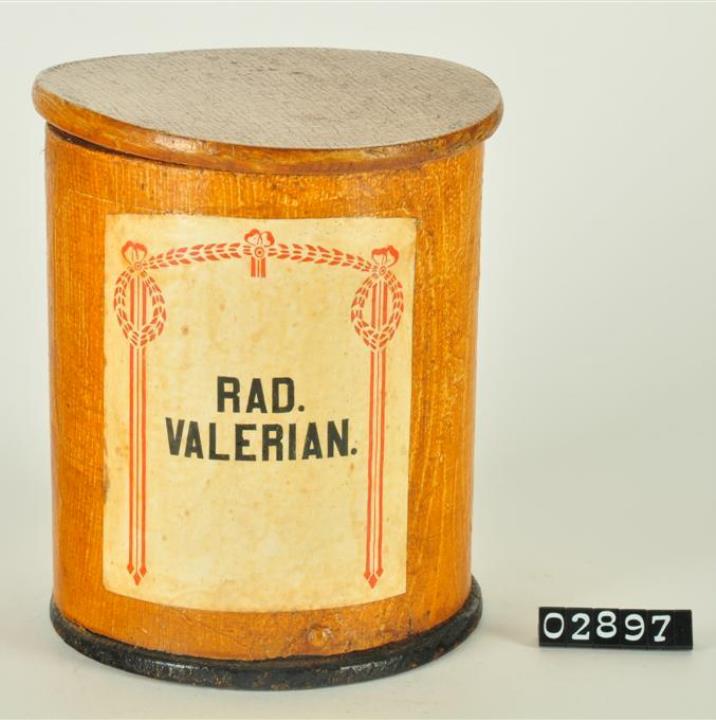 Braune, zylinderförmige Standdose aus maseriertem und lackiertem Hartpapier, leicht vorstehender, dunkelbrauner Holzboden und vorstehender, flacher Steckdeckel aus Holz. Schwarz signiert. Enthielt Baldrianwurzel.