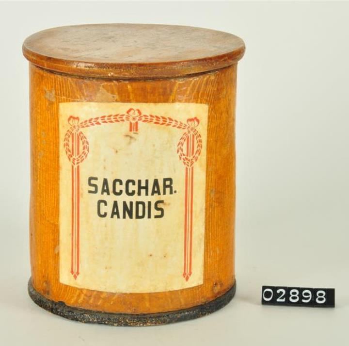 Braune, zylinderförmige Standdose aus maseriertem und lackiertem Hartpapier, leicht vorstehender, dunkelbrauner Holzboden und vorstehender, flacher Steckdeckel aus Holz. Schwarz signiert. Enthielt Kandiszucker.