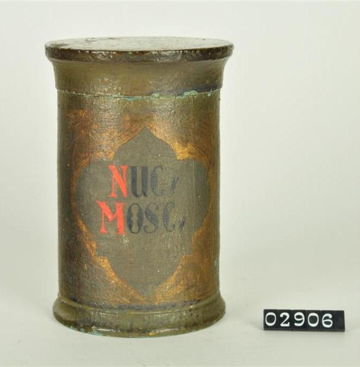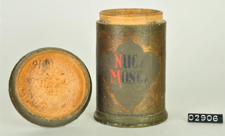Olivgrüne, zylinderförmige Holzdose (Holzbüchse) mit ausgestelltem Standfuß und eingepaßtem, flachen Stülpdeckel mit nach außen gebogenem Profil. Auf der Schauseite ausgespartes, geschwungenes Beschriftungsfeld mit Goldfarbe umrandet. Rot und schwarz signiert. Enthielt Muskatnüsse.
