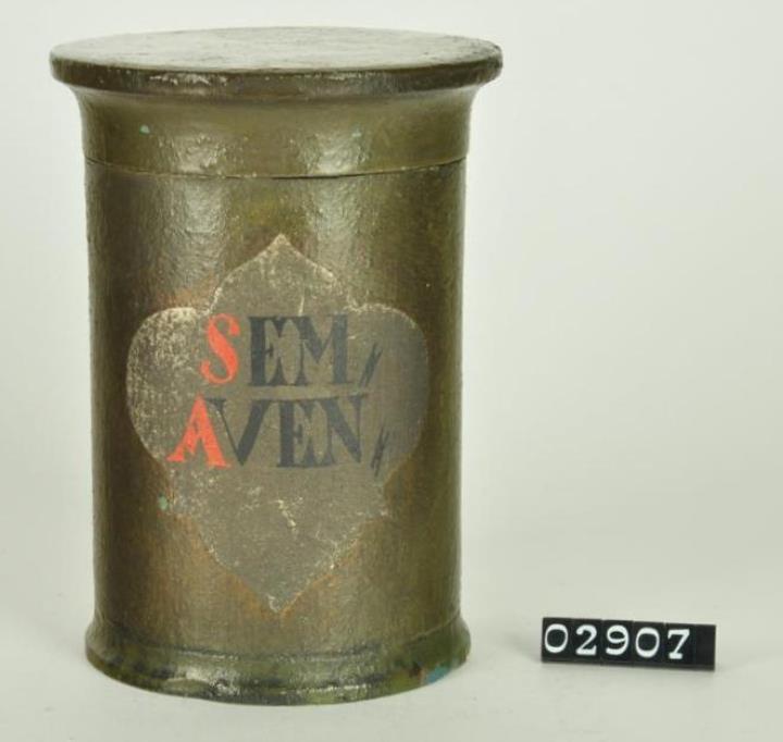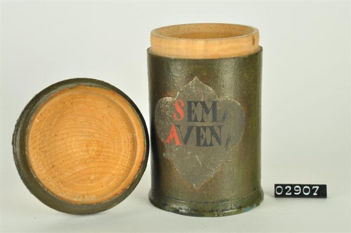 Olivgrüne, zylinderförmige Holzdose (Holzbüchse) mit abgesetztem Fuß und eingepaßtem, flachen Stülpdeckel mit nach außen gebogenem Profil. Auf der Schauseite ausgespartes, geschwungenes Beschriftungsfeld. Rot und schwarz signiert. Enthielt Hafer.