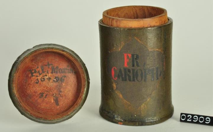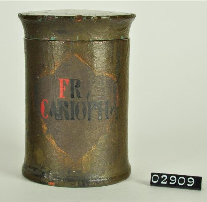 Olivgrüne, zylinderförmige Holzdose (Holzbüchse) mit ausgestelltem Standfuß und eingepaßtem, nahezu flachem Stülpdeckel mit nach außen gebogenem Profil. Auf der Schauseite ausgespartes, geschwungenes Beschriftungsfeld mit Goldfarbe umrandet. Rot und schwarz signiert.