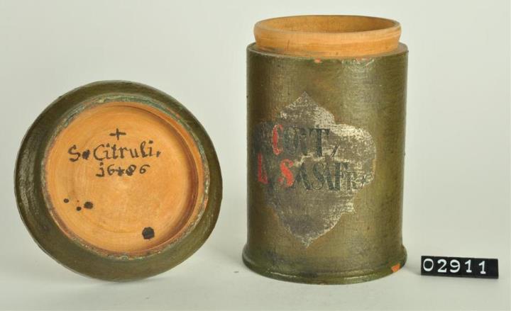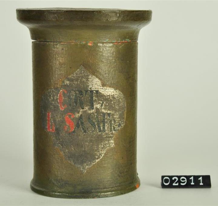 Olivgrüne, zylinderförmige Holzdose (Holzbüchse) mit abgesetztem Standfuß und eingepaßtem, flachem Stülpdeckel mit nach außen gebogenem Profil. Auf der Schauseite ausgespartes, geschwungenes Beschriftungsfeld mit Resten von Silberfarbe. Rot und schwarz signiert