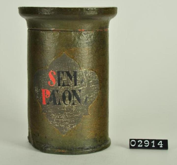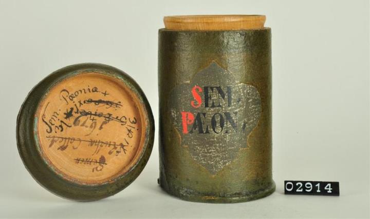 Olivgrüne, zylinderförmige Holzdose (Holzbüchse) mit abgesetztem Standfuß und eingepaßtem, flachem Stülpdeckel mit nach außen gebogenem Profil. Auf der Schauseite ausgespartes, geschwungenes Beschriftungsfeld mit Resten von Silberfarbe. Rot und schwarz signiert. Deckel innen mit der Jahreszahl 1679 und verschiedenen Beschriftungen und Preisangaben.. Enthielt Semen paeoniae = Samen der Pfingstrose.