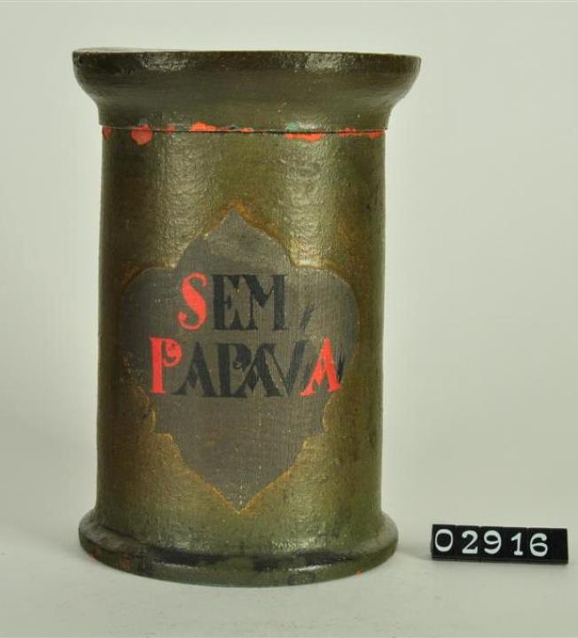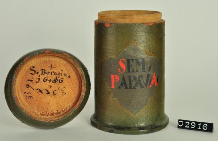 Olivgrüne, zylinderförmige Holzdose (Holzbüchse) mit abgesetztem Standfuß und eingepaßtem, flachem Stülpdeckel mit nach außen gebogenem Profil. Auf der Schauseite dunkelgrünes, ausgespartes und geschwungenes Beschriftungsfeld. Rot und schwarz signiert. Enthielt Mohnsamen.