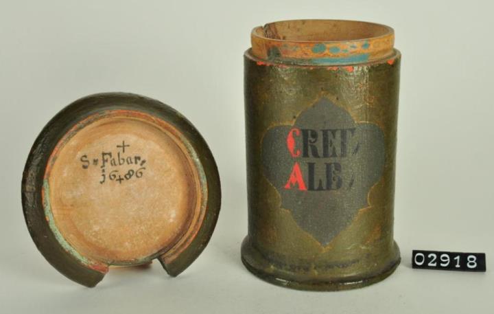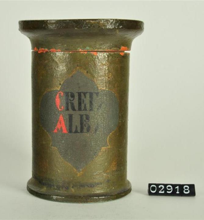 Olivgrüne, zylinderförmige Holzdose (Holzbüchse) mit abgesetztem Standfuß und eingepaßtem, flachem Stülpdeckel mit nach außen gebogenem Profil. Auf der Schauseite dunkelgrünes, ausgespartes und geschwungenes Beschriftungsfeld. Rot und schwarz signiert. Enthielt weiße Kreide.