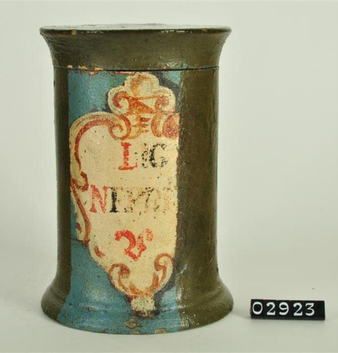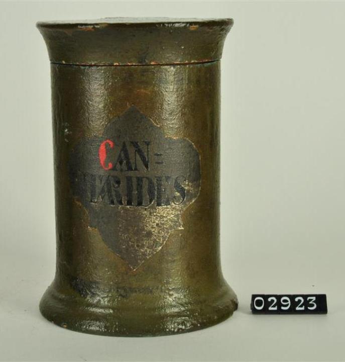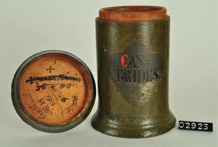 Olivgrüne, zylinderförmige Holzdose (Holzbüchse) mit ausgestelltem Standfuß und eingepaßtem, flachem Stülpdeckel mit nach außen gebogenem Profil. Auf der Schauseite ausgespartes, geschwungenes Beschriftungsfeld mit Silberfarbe. Rot und schwarz signiert. Auf der Rückseite zum größten Teil nicht übermalte, barock geschwungene Kartusche mit rotweißer Signatur auf cremeweißem Feld vor hellblauem Grund. Enthielt Spanische Fliegen.