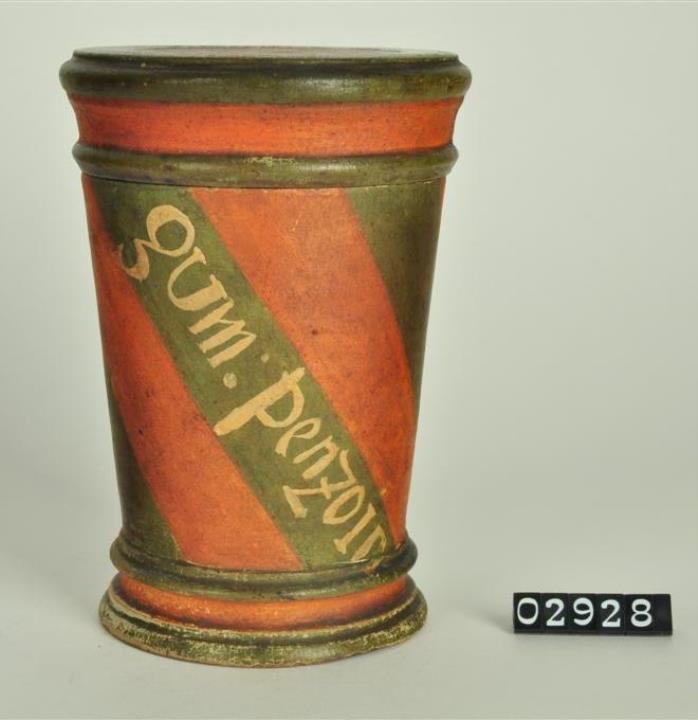 Konische Holzdose (Holzbüchse) mit abgesetztem, mehrfach profiliertem Standfuß und eingepaßtem, ebenfalls profiliertem, flachem Stülpdeckel. Braun-schwarze Bemalung in schräg geführten Streifen. Ein schwarzer Streifen als Beschriftungsfeld benutzt. Weiß signiert. Enthielt Benzoeharz.