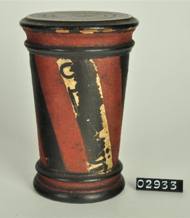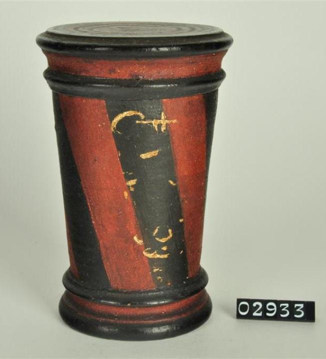 Konische Holzdose (Holzbüchse) mit abgesetztem, mehrfach profiliertem Standfuß und eingepaßtem, ebenfalls profiliertem, flachem Stülpdeckel. Braun-schwarze Bemalung in schräg geführten Streifen. Ein schwarzer Streifen als Beschriftungsfeld weiß übermalt. Schwarz signiert. Auf der Rückwand auf schwarzen Streifen weiß beschriftet.