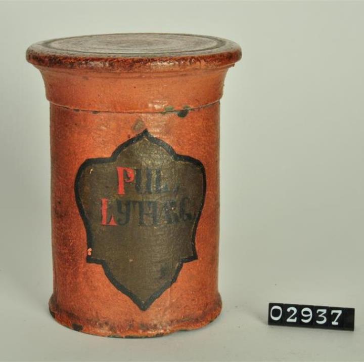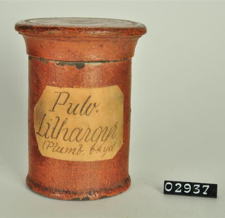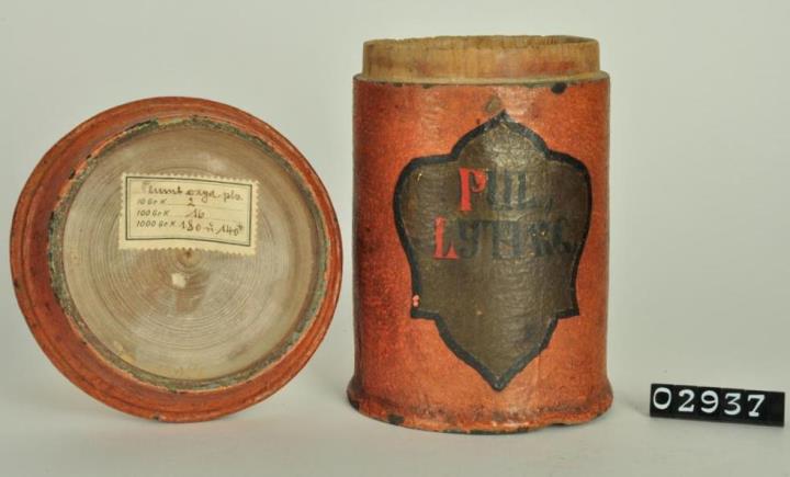 Ziegelrote, zylinderförmige Holzdose (Holzbüchse) mit abgesetztem Standfuß und eingepaßtem, flachem Stülpdeckel mit Rillen und nach außen gebogenem Profil. Auf der Rückseite achteckiges Papierschild. Auf der Schauseite geschwungenes, olivgrünes Beschriftungsfeld. Rot und schwarz signiert