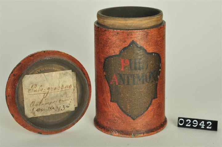 Ziegelrote zylinderförmige Holzdose (Holzbüchse) mit abgesetztem Standfuß und eingepaßtem, flachem Stülpdeckel mit nach außen gebogenem Profil. Auf der Schauseite geschwungenes, olivgrünes Beschriftungsfeld. Rot und schwarz signiert