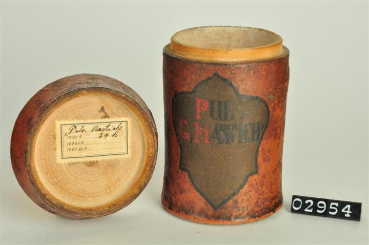 Braune, zylinderförmige Holzdose (Holzbüchse) mit ausgestelltem Standfuß und eingepaßtem, flachem Stülpdeckel und nach außen gebogenem Profil. Auf der Schauseite geschwungenes, olivgrünes Beschriftungsfeld. Rot und schwarz signiert. Enthielt Mastixpulver.