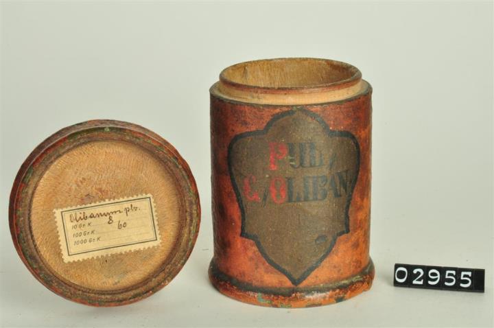 Braune, zylinderförmige Holzdose (Holzbüchse) mit abgesetztem Standfuß und eingepaßtem, kaum gewölbtem Stülpdeckel mit Wulst und nach außen gebogenem Profil. Auf der Schauseite geschwungenes, olivgrünes Beschriftungsfeld. Rot und schwarz signiert