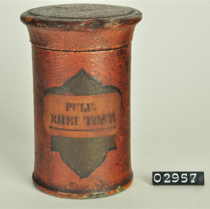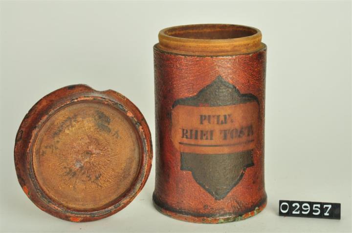 Braune, zylinderförmige Holzdose (Holzbüchse) mit ausgestelltem und abgesetztem Standfuß und eingepaßtem, kaum gewölbtem Stülpdeckel und nach außen gebogenem Profil. Auf der Schauseite geschwungenes, olivgrünes Beschriftungsfeld und darübergeklebtem, achteckigen Papierschild. Rot und schwarz signiert