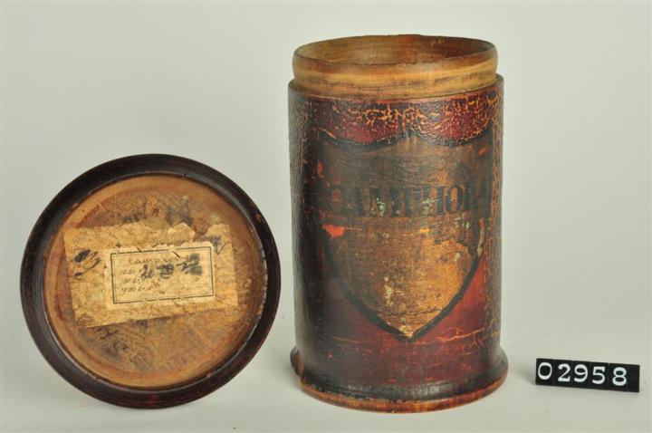 Braune, zylinderförmige Holzdose (Holzbüchse) mit ausgestelltem Standfuß und eingepaßtem, kaum gewölbtem Stülpdeckel und nach außen gebogenem Profil. Auf der Schauseite schildförmiges, goldenes Schild mit schwarzem Rand. Schwarz signiert