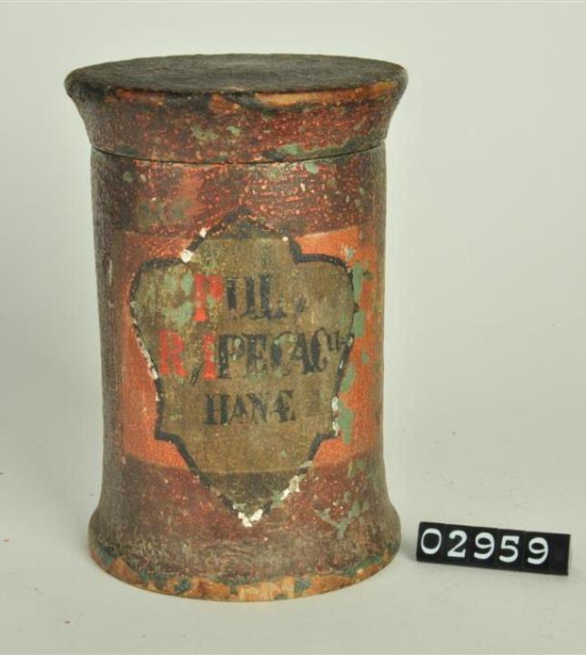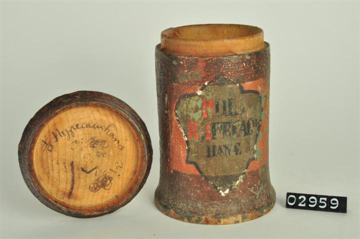 Braune, zylinderförmige Holzdose (Holzbüchse) mit ausgestelltem Standfuß und eingepaßtem, flachem Stülpdeckel und nach außen gebogenem Profil. Auf der Schauseite geschwungenes, olivgrünes Beschriftungsfeld. Rot und schwarz signiert