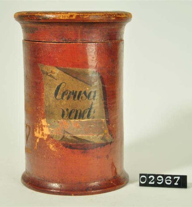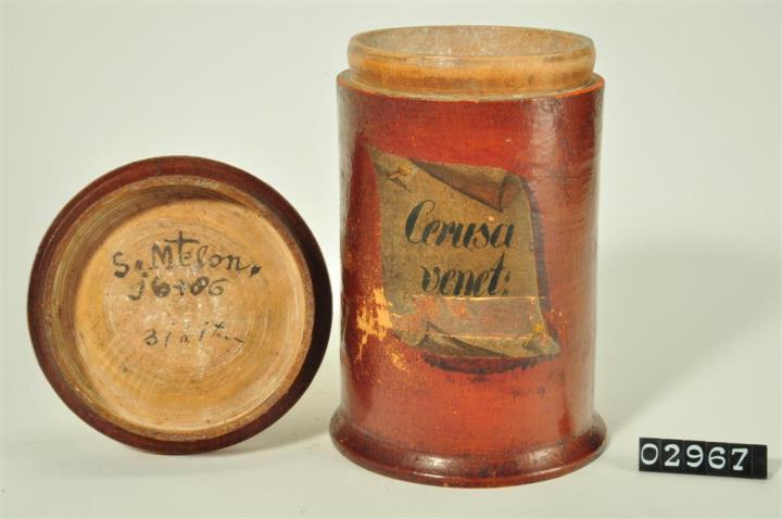 Braune, zylinderförmige Holzdose (Holzbüchse) mit ausgestelltem Standfuß und eingepaßtem, flachem Stülpdeckel und nach außen gebogenem Profil. Auf der Schauseite goldfarbenes Beschriftungsfeld in der Form eines mit zwei Nägeln befestigten Blatt Papier. Schwarz signiert