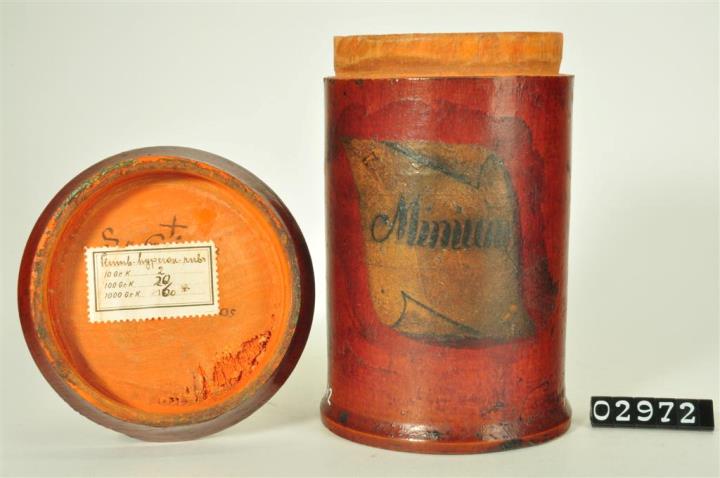 Braune, zylinderförmige Holzdose (Holzbüchse) mit ausgestelltem Standfuß und eingepaßtem, kaum gewölbtem Stülpdeckel und nach außen gebogenem Profil. Auf der Schauseite goldfarbenes Beschriftungsfeld in der Form eines mit zwei Nägeln befestigten Blatt Papier. Schwarz signiert