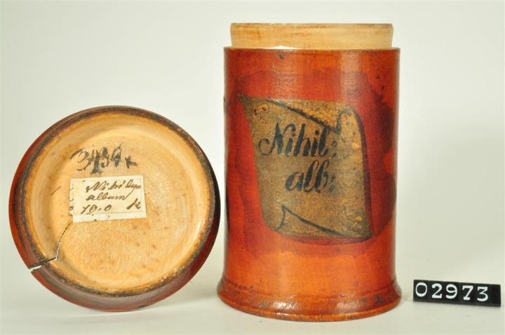 Braune, zylinderförmige Holzdose (Holzbüchse) mit ausgestelltem Standfuß und eingepaßtem, flachem Stülpdeckel und nach außen gebogenem Profil. Auf der Schauseite goldfarbenes Beschriftungsfeld in der Form eines mit zwei Nägeln befestigten Blatt Papier. Schwarz signiert