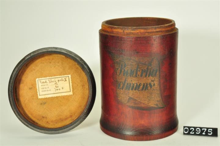 Braune, zylinderförmige Holzdose (Holzbüchse) mit ausgestelltem Standfuß und eingepaßtem, flachem Stülpdeckel und nach außen gebogenem Profil. Auf der Schauseite goldfarbenes Beschriftungsfeld in der Form eines mit zwei Nägeln befestigten Blatt Papier. Schwarz signiert