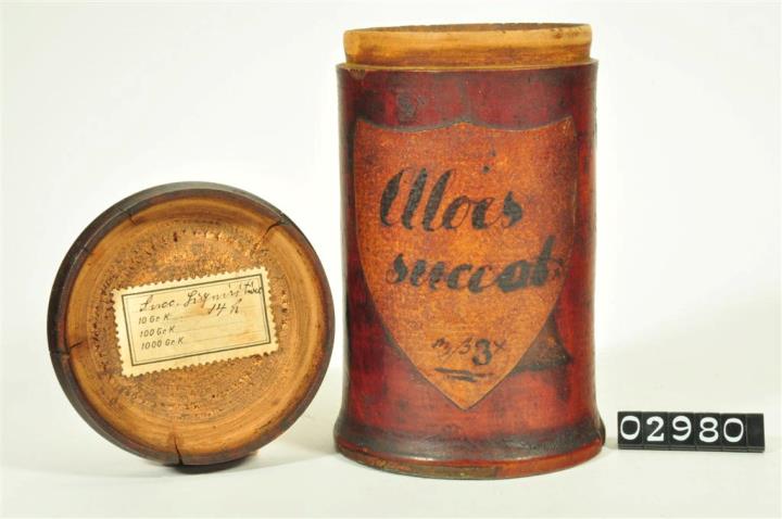 Braune, zylinderförmige Holzdose (Holzbüchse) mit ausgeselltem Standfuß und eingepaßtem, flachem Stülpdeckel und nach außen gebogenem Profil. Auf der Schauseite schildförmiges Beschriftungsfeld aus Papier. Schwarz signiert. Innenseite des Deckels mit gezahntem Etikett, beschriftet mit Succ. Liquiritiae 10 Gr. 14 h.