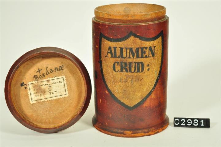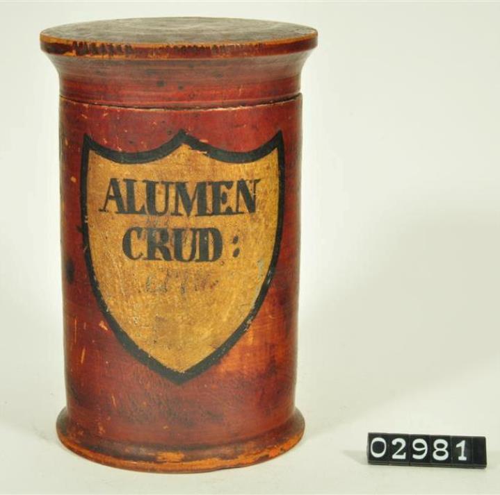 Braune, zylinderförmige Holzdose (Holzbüchse) mit abgesetztem Standfuß und eingepaßtem, kaum gewölbtem Stülpdeckel und nach außen gebogenem Profil. Auf der Schauseite schildförmiges und goldfarbenes Beschriftungsfeld mit schwarzem Rand. Schwarz signiert