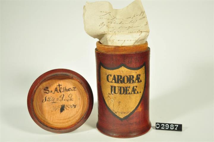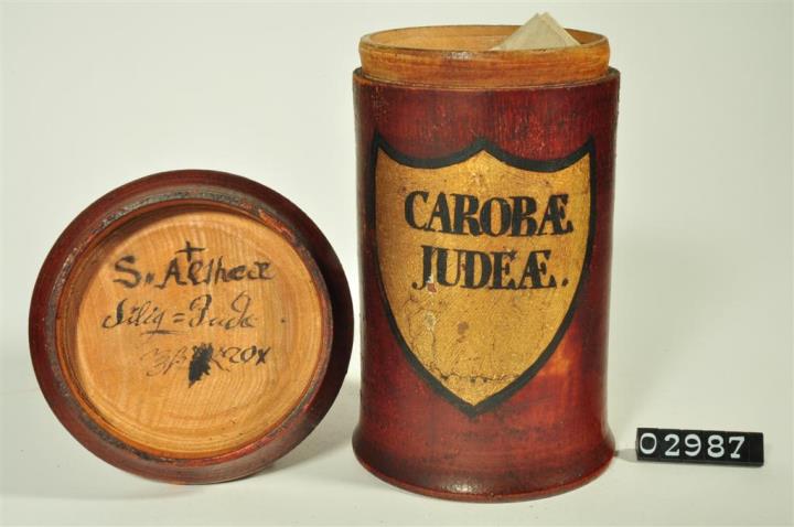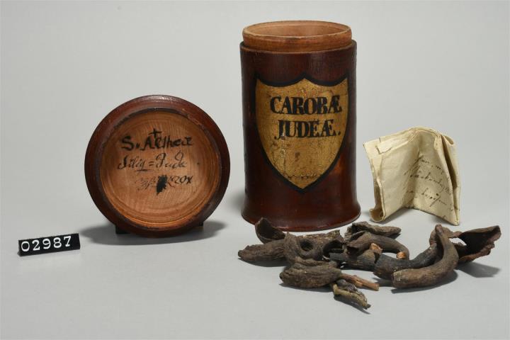 Braune, zylinderförmige Holzdose (Holzbüchse) mit ausgestelltem Standfuß und eingepaßtem, kaum gewölbtem Stülpdeckel und nach außen gebogenem Profil. Auf der Schauseite schildförmiges und goldfarbenes Beschriftungsfeld mit schwarzem Rand. Schwarz signiert. Enthält Judas Schoten.