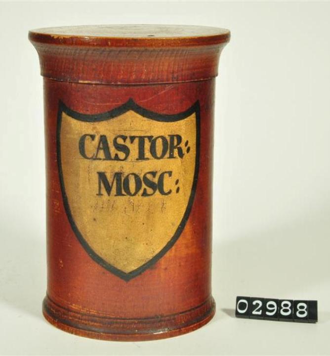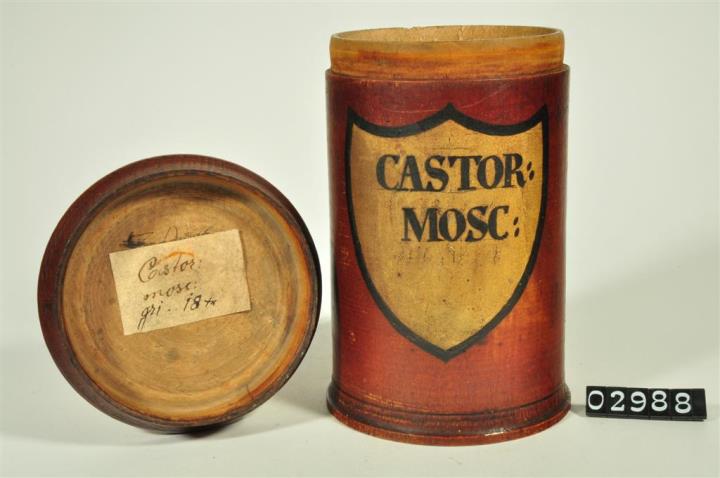 Braune, zylinderförmige Holzdose (Holzbüchse) mit abgesetztem Standfuß und eingepaßtem, flachem Stülpdeckel und nach außen gebogenem Profil. Auf der Schauseite schildförmiges und goldfarbenes Beschriftungsfeld mit schwarzem Rand. Schwarz signiert