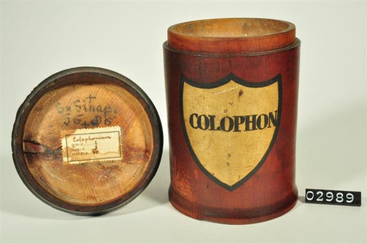 Braune, zylinderförmige Holzdose (Holzbüchse) mit ausgestelltem Standfuß und eingepaßtem, kaum gewölbtem Stülpdeckel und nach außen gebogenem Profil. Auf der Schauseite schildförmiges und goldfarbenes Beschriftungsfeld mit schwarzem Rand. Schwarz signiert