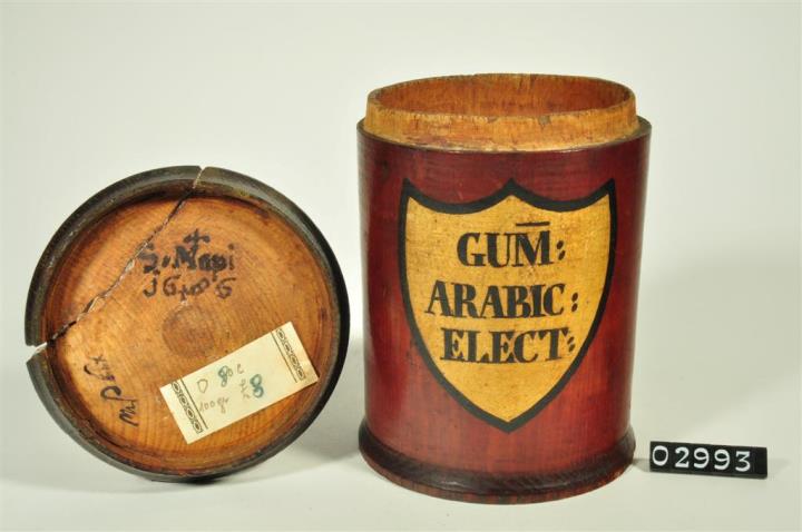 Braune, zylinderförmige Holzdose (Holzbüchse) mit ausgestelltem Standfuß und eingepaßtem, flachem Stülpdeckel und nach außen gebogenem Profil. Auf der Schauseite schildförmiges und goldfarbenes Beschriftungsfeld mit schwarzem Rand. Schwarz signiert