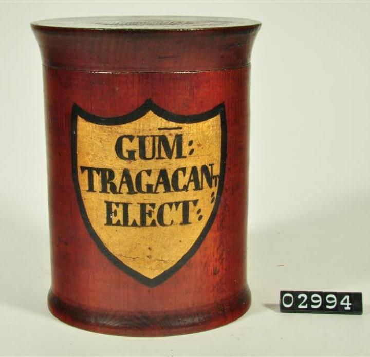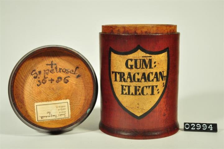 Braune, zylinderförmige Holzdose (Holzbüchse) mit ausgestelltem Standfuß und eingepaßtem, flachem Stülpdeckel und nach außen gebogenem Profil. Auf der Schauseite schildförmiges und goldfarbenes Beschriftungsfeld mit schwarzem Rand. Schwarz signiert