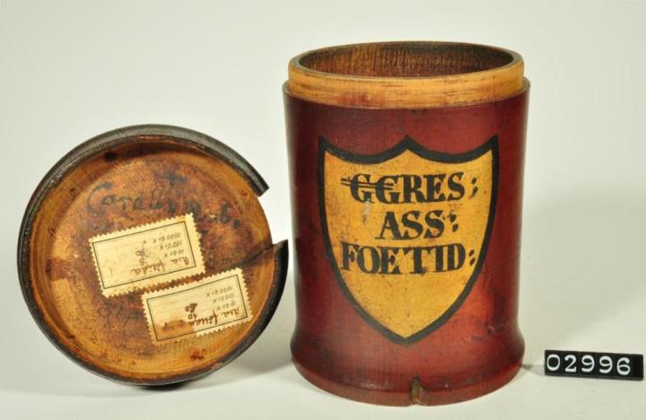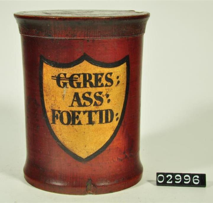Braune, zylinderförmige Holzdose (Holzbüchse) mit ausgestelltem Standfuß und eingepaßtem, flachem Stülpdeckel und nach außen gebogenem Profil. Auf der Schauseite schildförmiges und goldfarbenes Beschriftungsfeld mit schwarzem Rand. Schwarz signiert