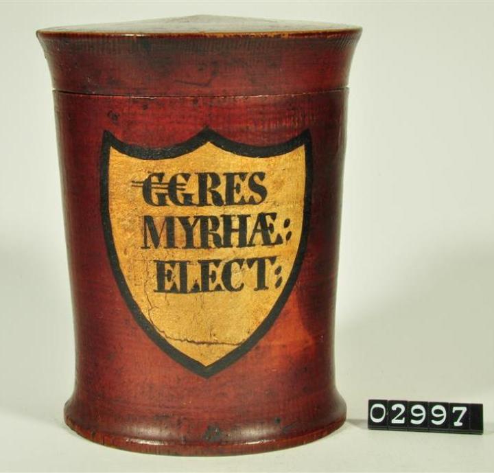 Braune, konische Holzdose (Holzbüchse) mit ausgestelltem Standfuß und eingepaßtem, leicht gewölbtem Stülpdeckel und nach außen gebogenem Profil. Auf der Schauseite schildförmiges und goldfarbenes Beschriftungsfeld mit schwarzem Rand. Schwarz signiert