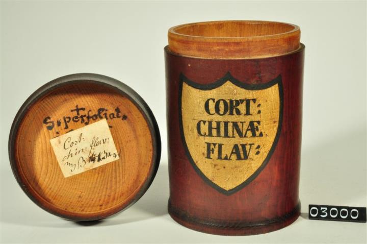 Braune, zylinderförmige Holzdose (Holzbüchse) mit abgesetztem Standfuß und eingepaßtem, flachem Stülpdeckel und nach außen gebogenem Profil. Auf der Schauseite schildförmiges und goldfarbenes Beschriftungsfeld mit schwarzem Rand. Schwarz signiert