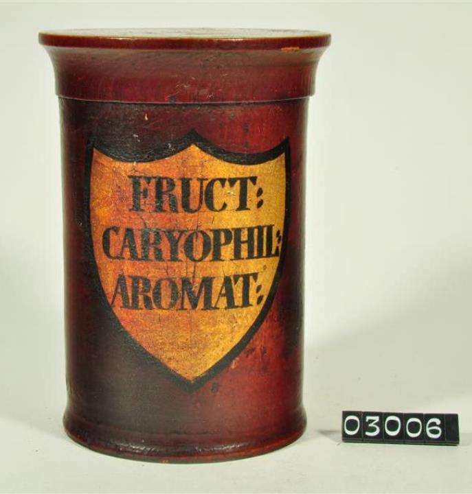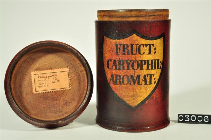 Braune, zylinderförmige Holzdose (Holzbüchse) mit ausgestelltem Standfuß und eingepaßtem, flachem Stülpdeckel und nach außen gebogenem Profil. Auf der Schauseite schildförmiges und goldfarbenes Beschriftungsfeld mit schwarzem Rand. Schwarz signiert