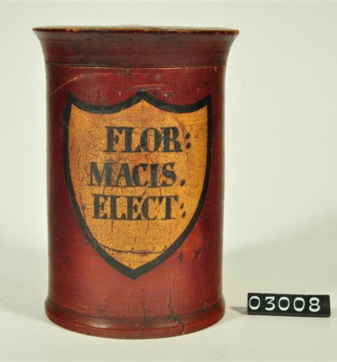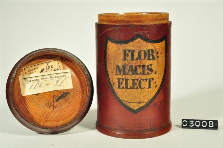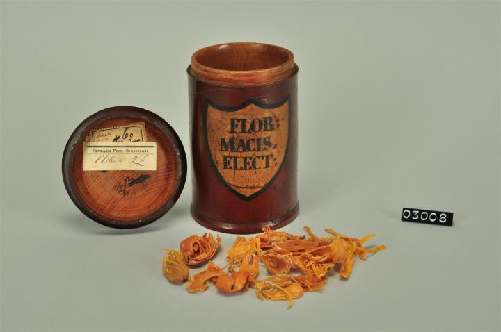 Braune, zylinderförmige Holzdose (Holzbüchse) mit ausgestelltem Standfuß und eingepaßtem, flachem Stülpdeckel und nach außen gebogenem Profil. Auf der Schauseite schildförmiges und goldfarbenes Beschriftungsfeld mit schwarzem Rand. Schwarz signiert. Mit Inhalt: Macisblüten.