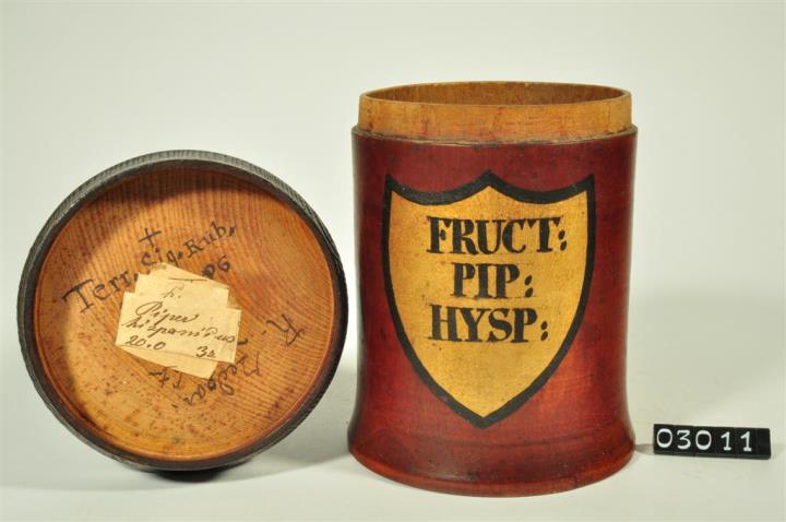 Braune, zylinderförmige Holzdose (Holzbüchse) mit ausgestelltem Standfuß und eingepaßtem, leicht gewölbtem Stülpdeckel und nach außen gebogenem Profil. Auf der Schauseite schildförmiges und goldfarbenes Beschriftungsfeld mit schwarzem Rand. Schwarz signiert
