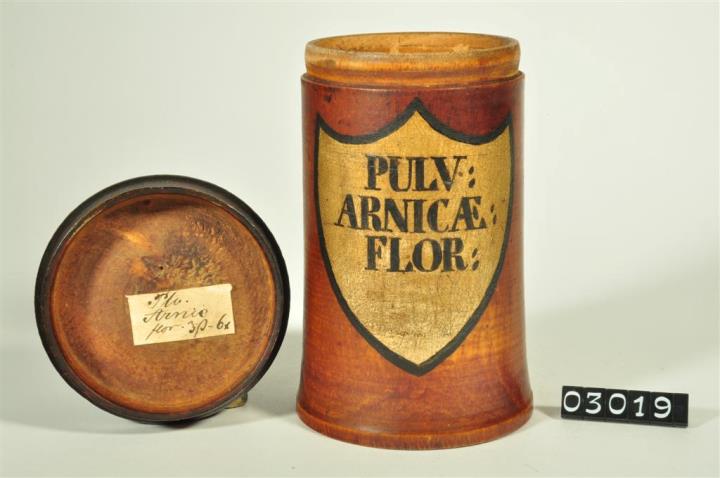 Braune, zylinderförmige Holzdose (Holzbüchse) mit ausgestelltem und abgesetztem Standfuß und eingepaßtem, flachem Stülpdeckel und nach außen gebogenem Profil. Auf der Schauseite schildförmiges und goldfarbenes Beschriftungsfeld mit schwarzem Rand. Schwarz signiert