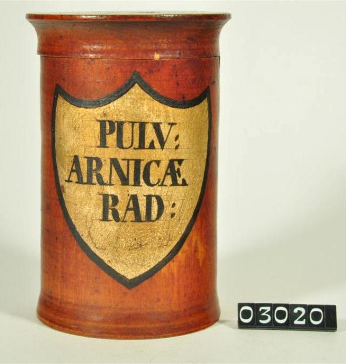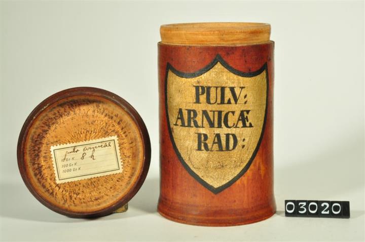 Braune, zylinderförmige Holzdose (Holzbüchse) mit ausgestelltem und abgesetztem Standfuß und eingepaßtem, flachem Stülpdeckel und nach außen gebogenem Profil. Auf der Schauseite schildförmiges und goldfarbenes Beschriftungsfeld mit schwarzem Rand. Schwarz signiert