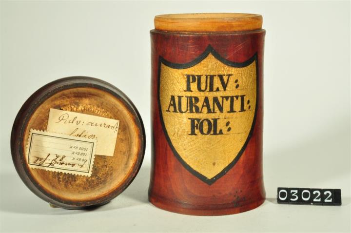Braune, zylinderförmige Holzdose (Holzbüchse) mit ausgestelltem und abgesetztem Standfuß und eingepaßtem, flachem Stülpdeckel und nach außen gebogenem Profil. Auf der Schauseite schildförmiges und goldfarbenes Beschriftungsfeld mit schwarzem Rand. Schwarz signiert