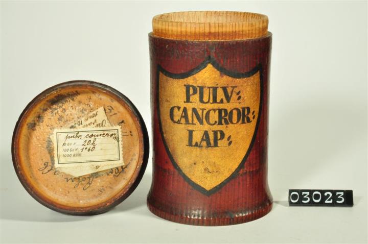 Braune, zylinderförmige Holzdose (Holzbüchse) mit ausgestelltem und abgesetztem Standfuß und eingepaßtem, kaum gewölbtem Stülpdeckel und nach außen gebogenem Profil. Auf der Schauseite schildförmiges und goldfarbenes Beschriftungsfeld mit schwarzem Rand. Schwarz signiert