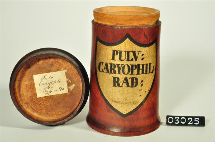 Braune, zylinderförmige Holzdose (Holzbüchse) mit ausgestelltem und abgesetztem Standfuß und eingepaßtem, flachem Stülpdeckel und nach außen gebogenem Profil. Auf der Schauseite schildförmiges und goldfarbenes Beschriftungsfeld mit schwarzem Rand. Schwarz signiert
