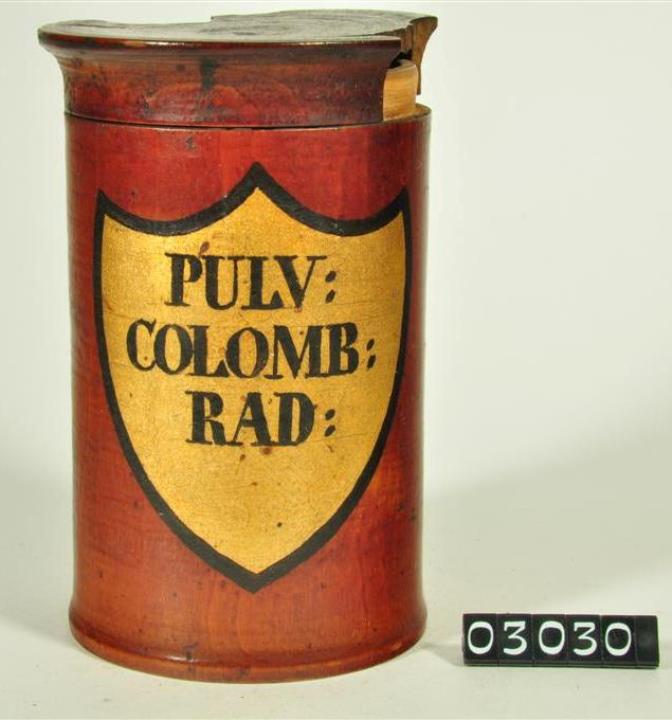 Braune, zylinderförmige Holzdose (Holzbüchse) mit ausgestelltem und abgesetztem Standfuß und eingepaßtem, flachem Stülpdeckel und nach außen gebogenem Profil. Auf der Schauseite schildförmiges und goldfarbenes Beschriftungsfeld mit schwarzem Rand. Schwarz signiert